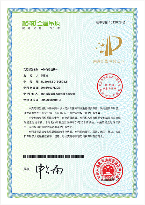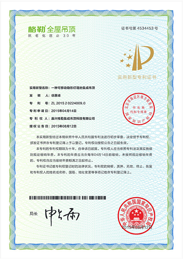 格勒作为专注于家居建材的高端品牌,累计取得专利88项,对产品的创新和研发不断加大投入,2019年拟成为国家高新技术企业。同时格勒先后被授予“十大公认品牌”“十大新锐品牌”“客厅吊顶艺术大奖”“十大公信力品牌”“产品创新品牌”等荣誉。格勒立志于“为每个家的健康和品味做出贡献”;秉承“成就客户、以人为本”的企业宗旨,不断砥砺前行。