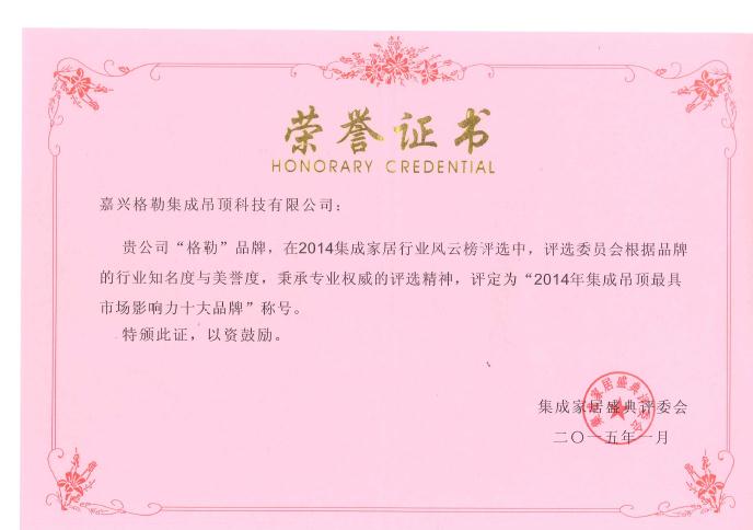 格勒吊顶获评2014年集成吊顶最具行业影响力十大品牌