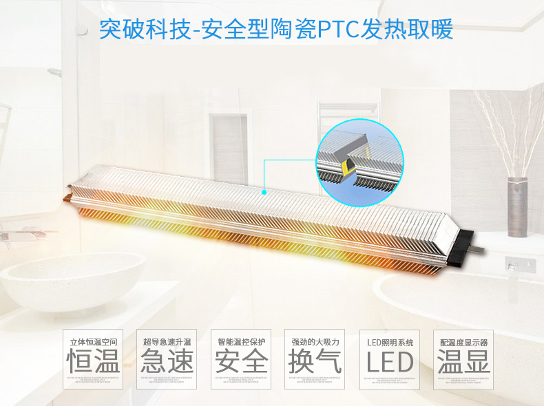 一台浴霸,开启速热新时代,进口PTC发热,急速制热,热量迅速弥漫至整个洗浴空间。