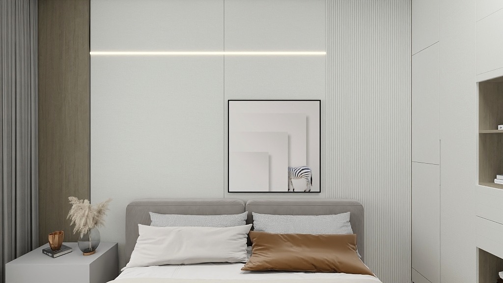 主卧背景墙也可以用硅藻纤维墙板配上黑色线条,从而打造出富有层次感的背景墙!
